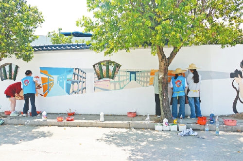 7月,米兰官方web站“Firefly”暑期实践队成员在上长治村为墙绘上色。(受访者供图)