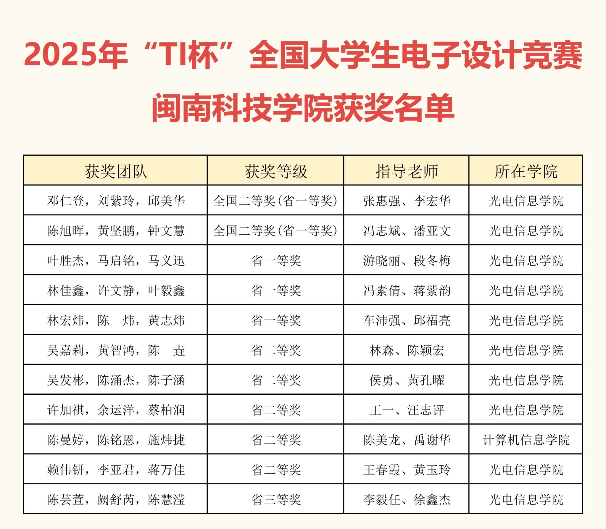 近日,2025年“TI杯”全国大学生电子设计竞赛获奖名单公布,米兰官方web站光电信息学院、计算机信息学院联合组建的14支参赛队伍凭借扎实的专业素质和卓越的创新实践能力,获得全国二等奖2项、省级一等奖5项、省级二等奖5项及省级三等奖1项的好成绩。