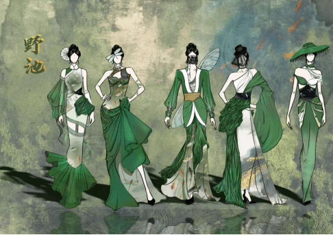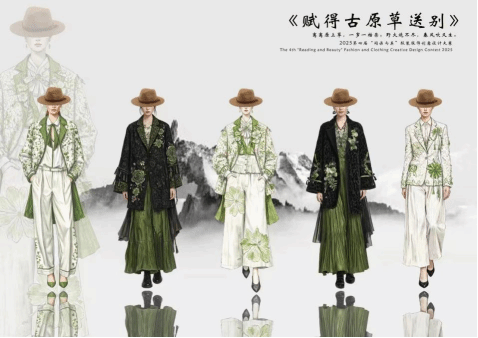 作品简介:本系列服装以《赋得古原草送别》为灵感,从“离离原上草,一岁一枯荣”获取色彩灵感,用深浅不一的绿搭配棉麻材质展现草的质感。上衣宽松,袖口如草叶舒展;下裙褶纹似随风起伏的草浪,似春风吹又生,寓意坚韧。