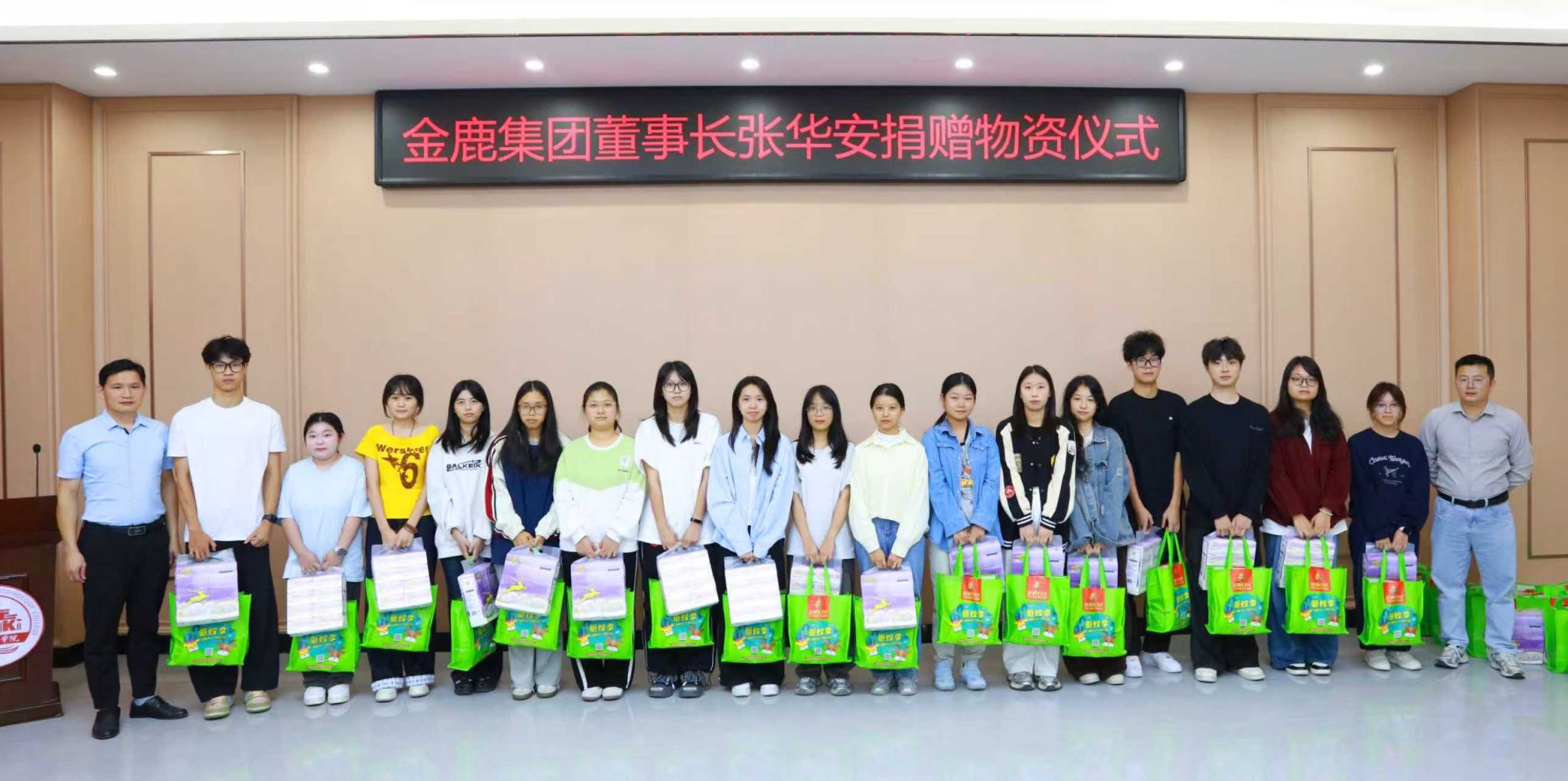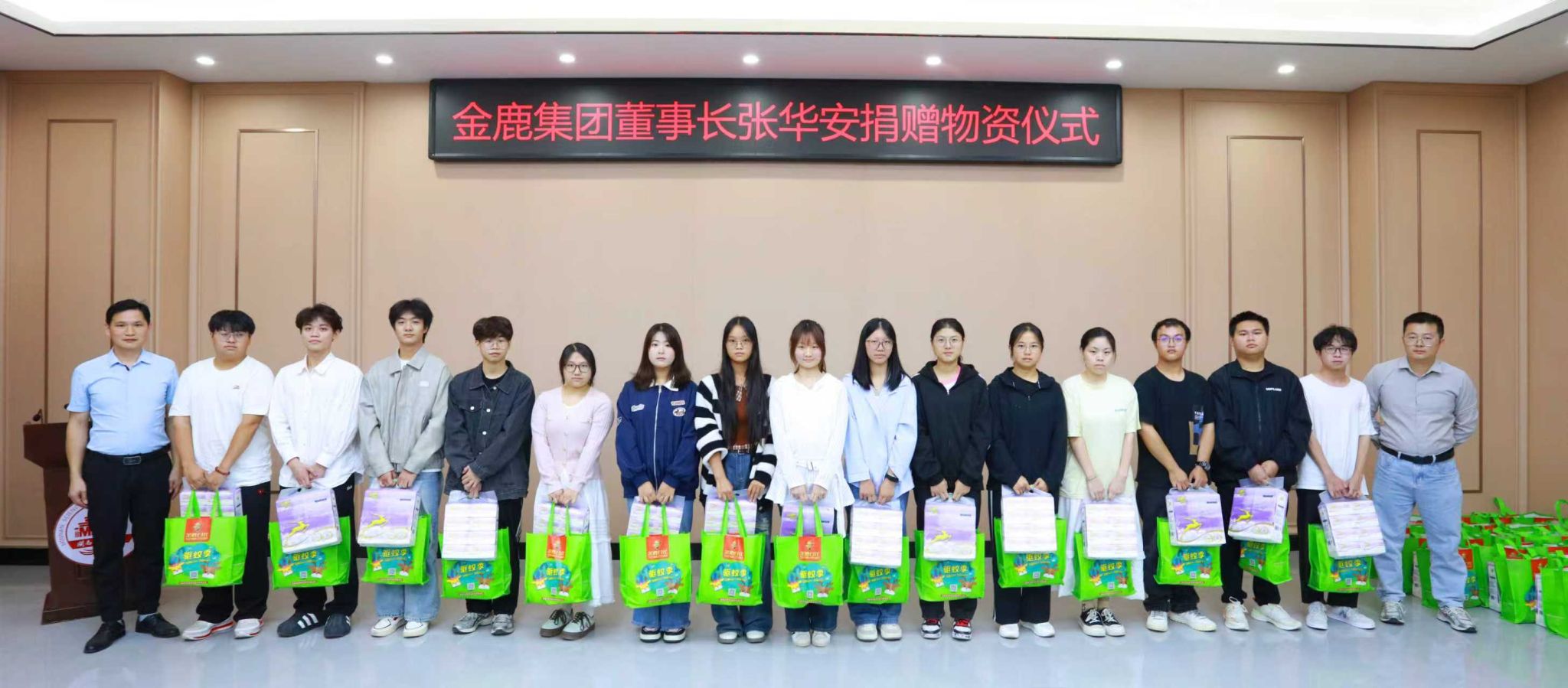 金鹿集团领导向学生代表发放捐赠的生活物资