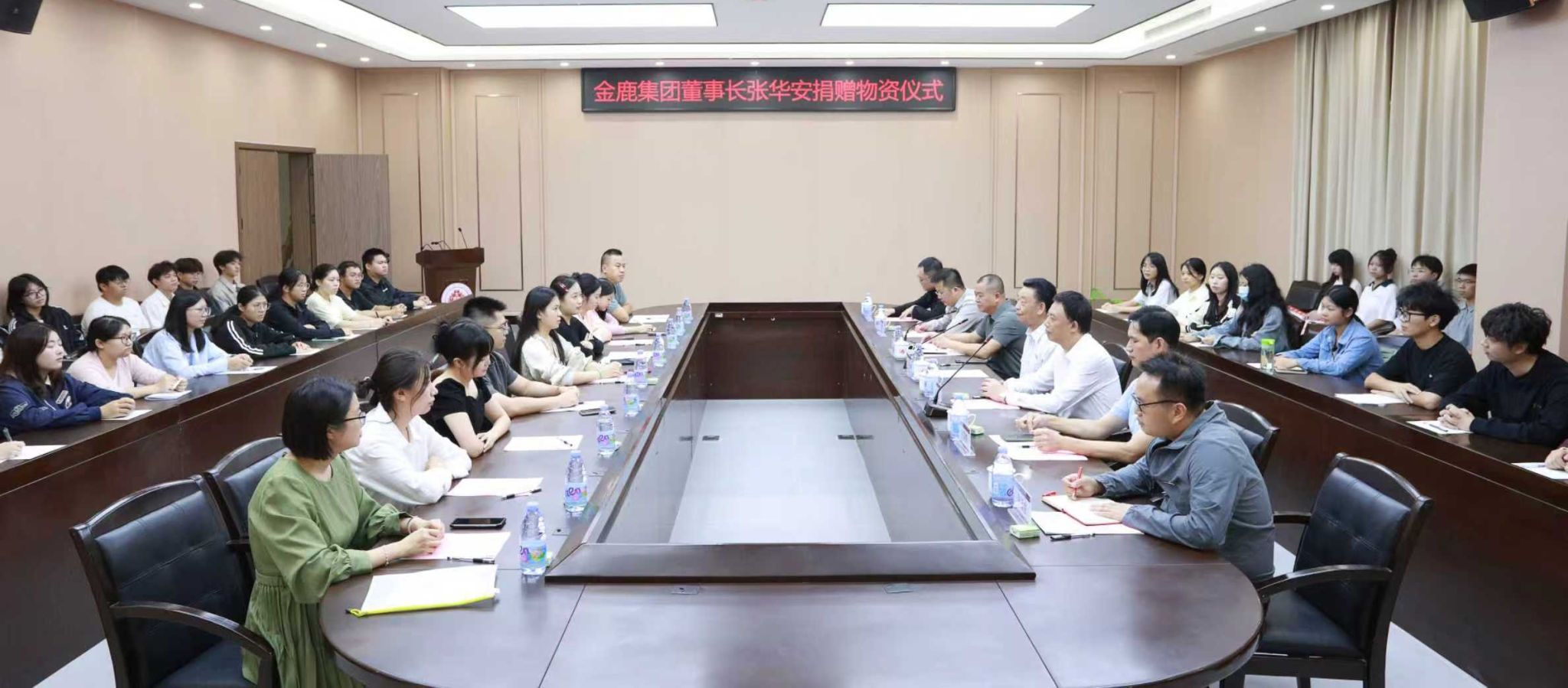 10月23日,金鹿集团董事长张华安带队到学校,捐赠金鹿集团生产的日常生活物资,商学院80名学生接受捐赠。校长袁自煌、校党委书记李旭会见张华安董事长一行。