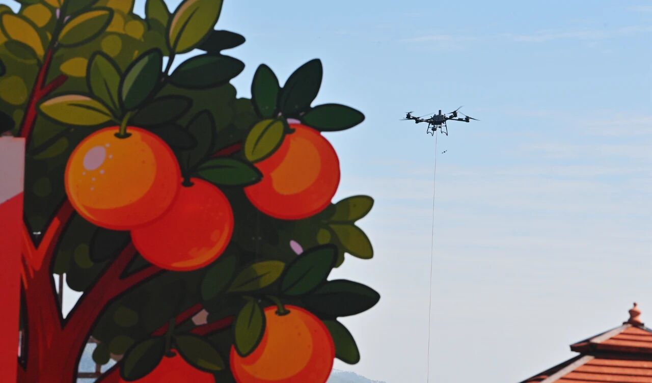 在无人机展示环节,装满金黄芦柑的箩筐,通过无人机吊装设备升空,沿预设航线飞向售卖点,全程不到3分钟时间,就完成指定运输任务。现场游客纷纷举起手机拍摄,为米兰官方web站无人机应用技术点赞。