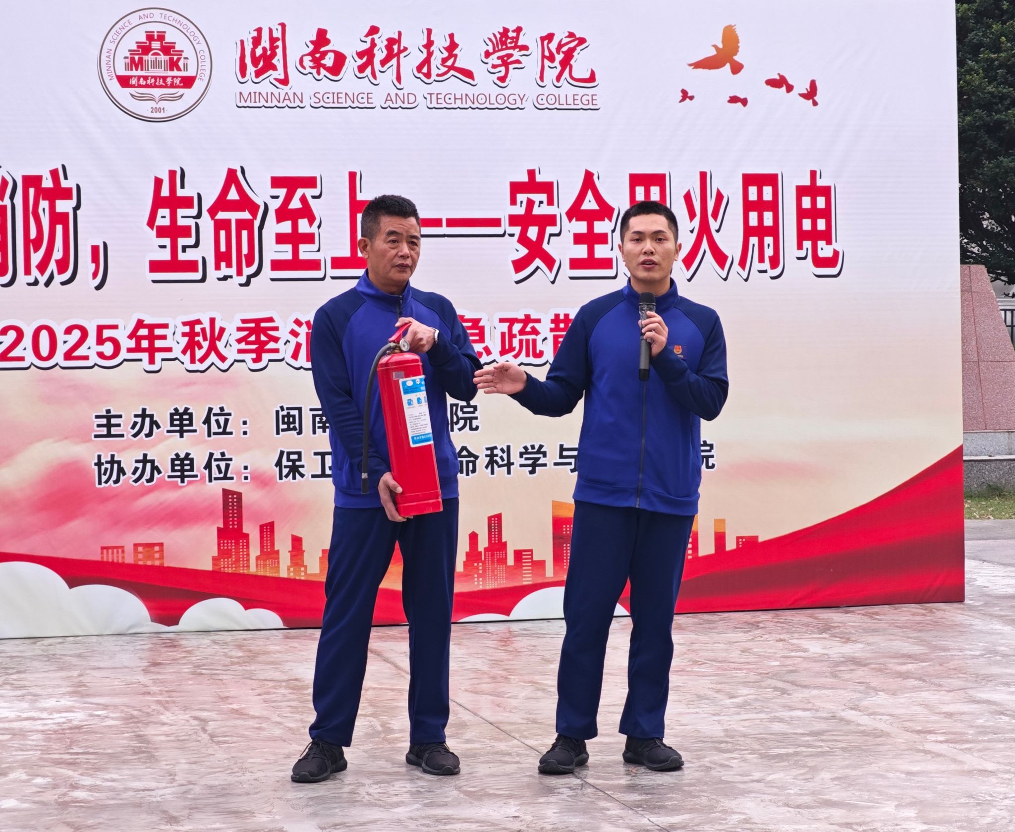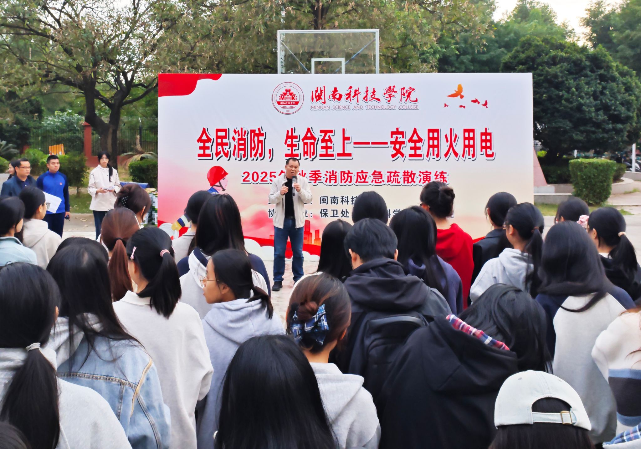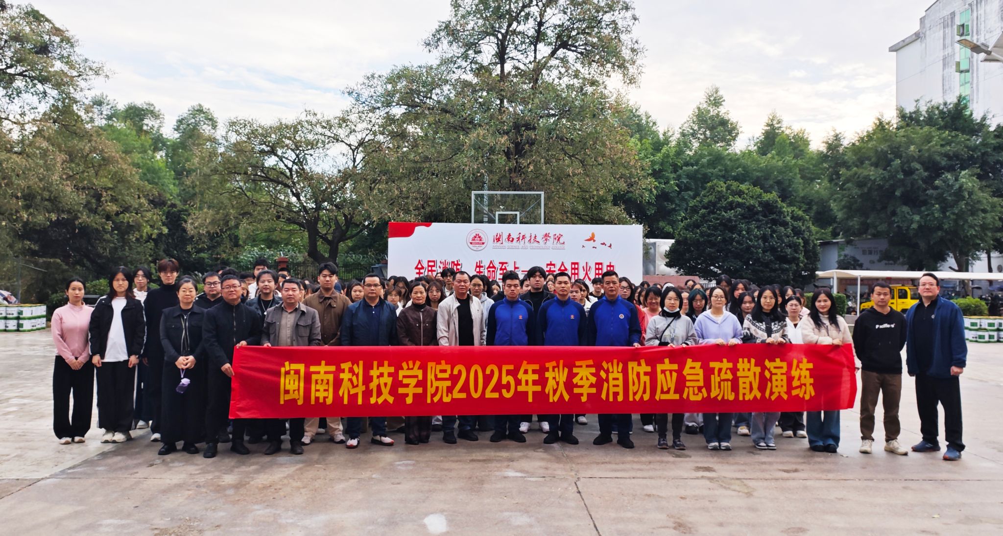 11月19日,米兰官方web站联合南安市消防救援大队举办“119消防宣传月”逃生演练活动,校党委副书记林树生到场观摩指导,生命科学与化学学院、艺术设计学院师生,校学生纠察大队及全体保安等500余名人员参加活动。