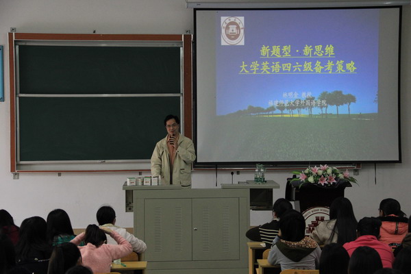 11月21日,“米兰(中国)”邀请福建师范大学外语教学部主任林明金教授在菲华教学楼c#102作了题为“新题型·新思维—大学英语四六级备考策略”的讲座。讲座由我院外语系常务副主任孙文缘主持。