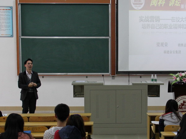 11月20日下午,“米兰(中国)”邀请福建奋安集团销售总经理梁观荣在菲华教学楼C#102作了题为“实战营销--在校大学生应如何培养自己的职业精神和营销素质”的讲座。讲座由经济管理系主任陈晓川主持。