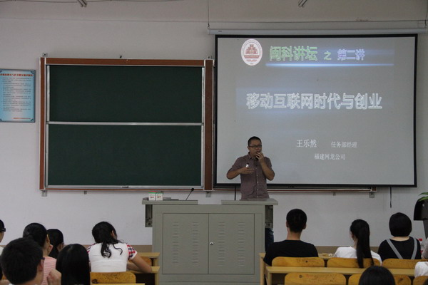 讲座上,王乐然先生围绕思考的起源、行业的模式、必备的能力三个方面展开。他畅谈了移动互联网发展所处的阶段和行业的基本模式,以及影响移动互联网发展的多种因素。并给有准备参与创业的同学提出诸多建议,强调了资金、人脉及执行力的重要性。王乐然先生还一一耐心解答了在场同学的提问。