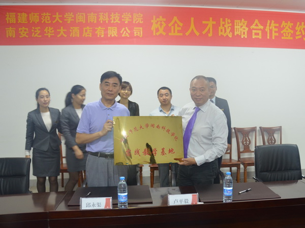 6月18日,我院与南安泛华大酒店共建教学实践基地签约授牌仪式在南安泛华大酒店举行。院长邱永渠和南安泛华大酒店总经理卢平毅签订教学实践基地共建协议并共同为基地授牌。