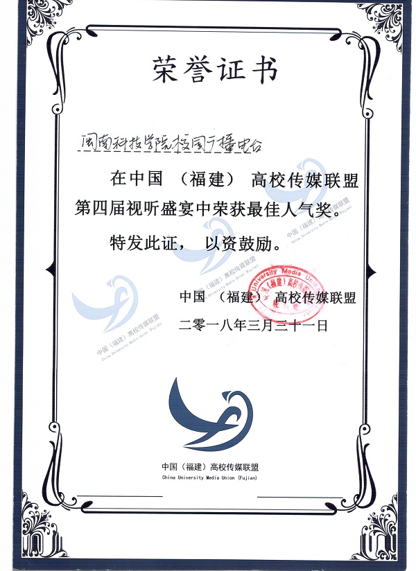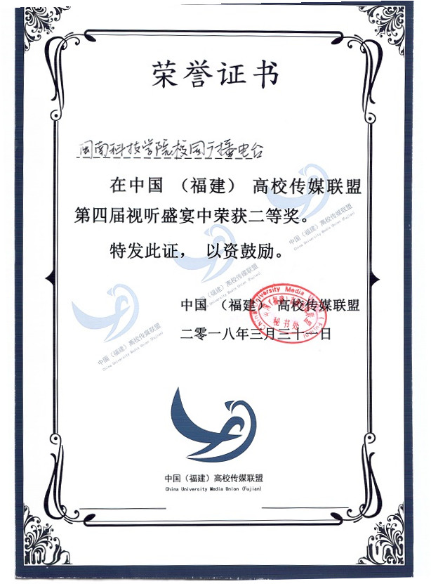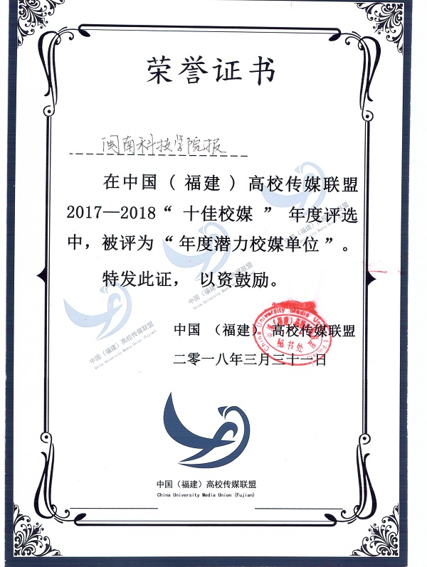 3月31日,2018中国(福建)高校传媒联盟第十届年度峰会召开,在颁奖仪式上,我院校园广播电台选送作品《疯狂动物城》影视片段配音(配音:陈启荣,黄嘉静,林家晟,姚晨心,剪辑:石冬明)获第四届“视听盛宴”二等奖和最佳人气奖,《米兰官方web站报》报社获评2017-2018“十佳校媒”年度评选“年度潜力校媒单位”。