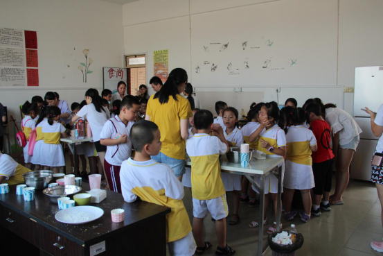 “一手握着筷子,一手托着碗”“顺时针搅拌”学生社团联合会食尚协会的同学们正在为小记者们示范打蛋,同学们还分别为他们讲解和面、揉馅、压制成型等月饼制作流程技巧。