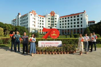 教师在庆祝新中国成立70周年主题花坛前合影