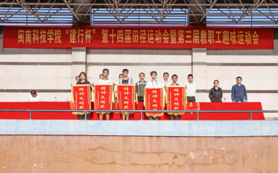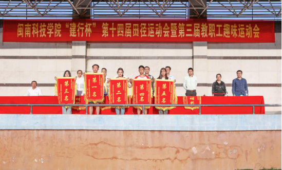 本届运动会总裁判长周书磊老师宣读本届运动会获奖团队名单。计算机信息学院、生命科学与化学学院获教工趣味运动会团体总分第一名,商学院获第二名,通识教育学院、马克思主义学院、人文学院获第三名,光电信息学院获第四名;计算机信息学院、人文学院、艺术设计学院、商学院、土木工程学院获开幕式入场表演前五名;商学院、光电信息学院、计算机信息学院、生命科学与化学学院、艺术设计学院获田径运动会团体总分前五名;艺术设计学院、计算机信息学院、生命科学与化学学院、商学院、人文学院获“精神文明奖”。