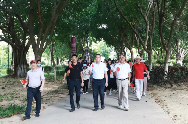 在南安市武荣公园,参加活动的教职工手持五星红旗,兴致高昂,迈着矫健有力的步伐,沿着公园主干道健步前行。一路上,大家相互鼓励、欢声笑语,气氛轻松,充分展现了米兰官方web站教职工团结奋进、拼搏向上的精神面貌。